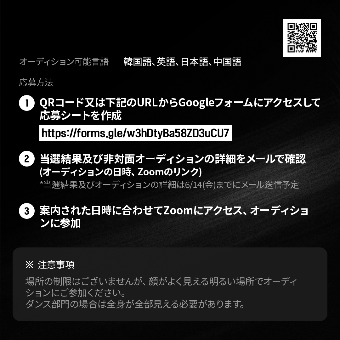 6/10(月)12:00から48時間以内にご応募頂いた方の中から100名様を抽選し、YGオーディション担当者と1:1のオンライン非対面オーディションを行います。